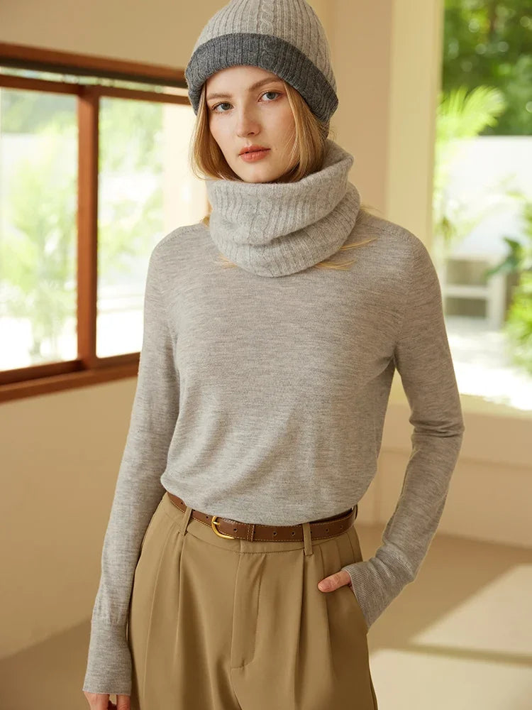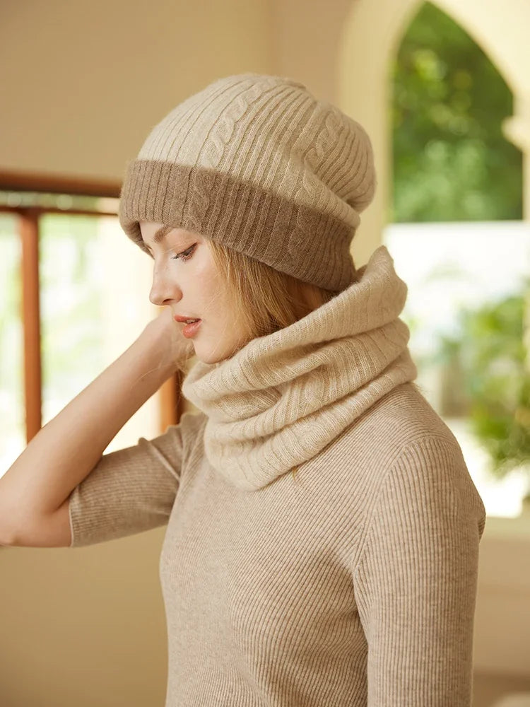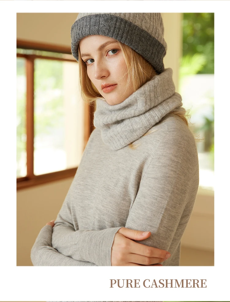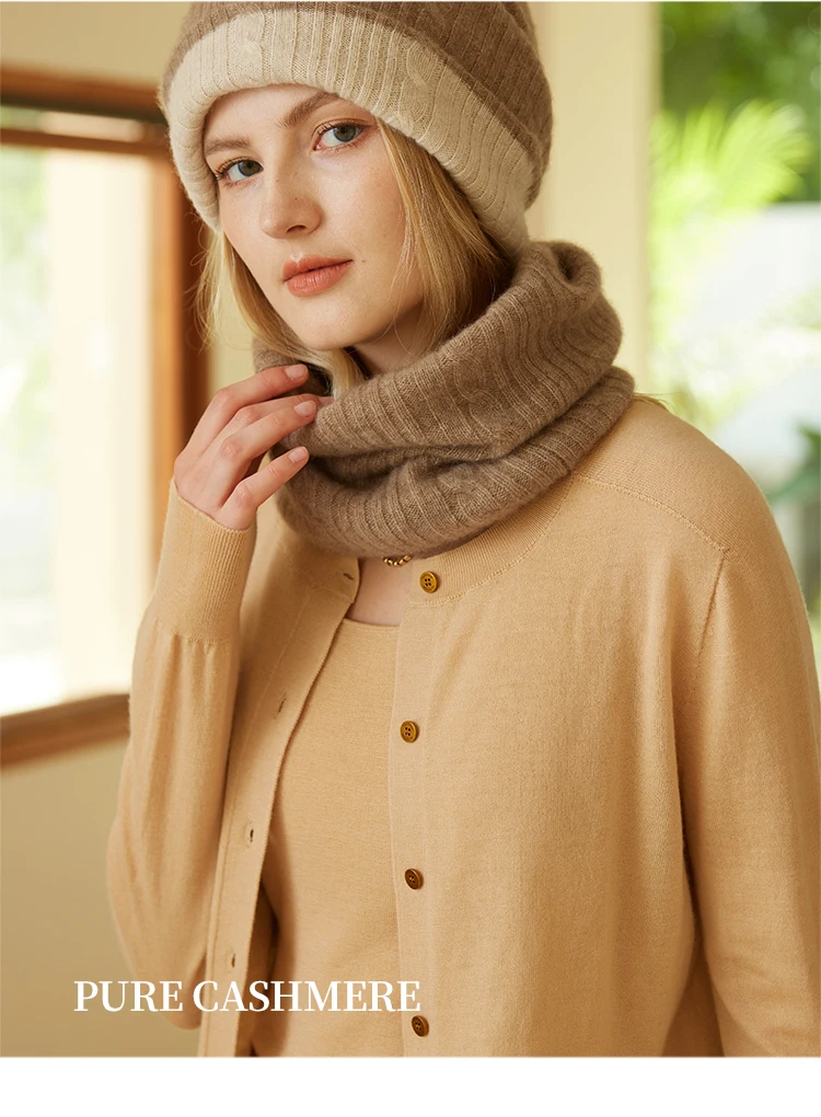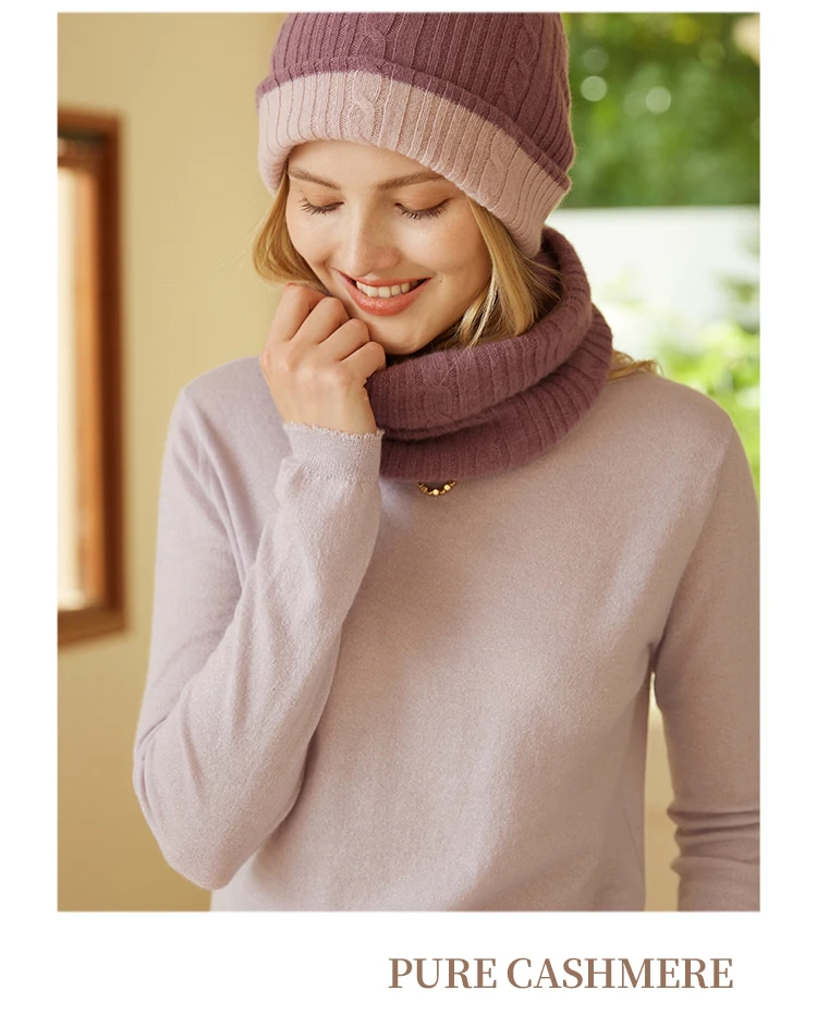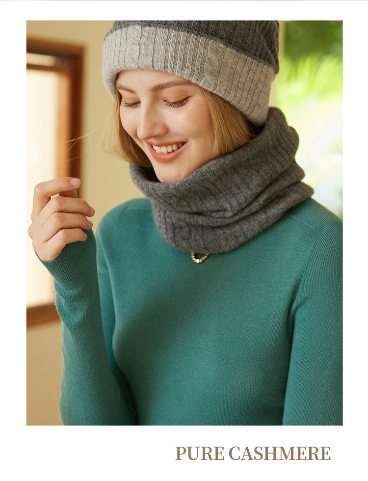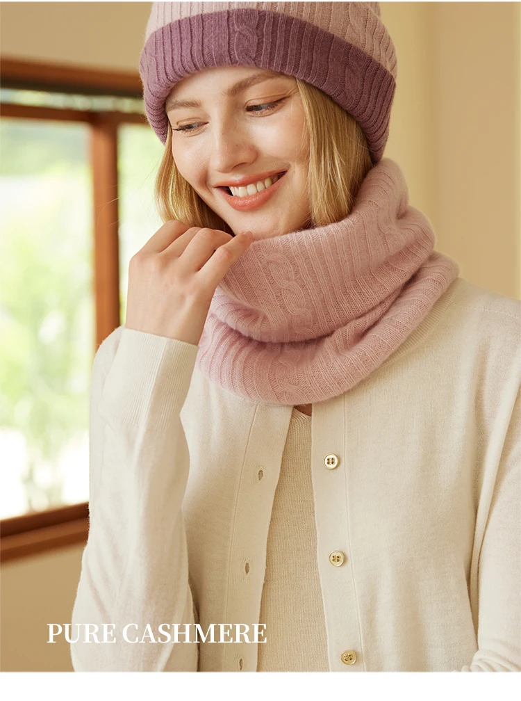Women 100% Cashmere Tube Scarf Cable Knit Neck Warmer Ring Double Faced Thick Cap Reversible Knitted Beanies Winter 2-Pcs Set